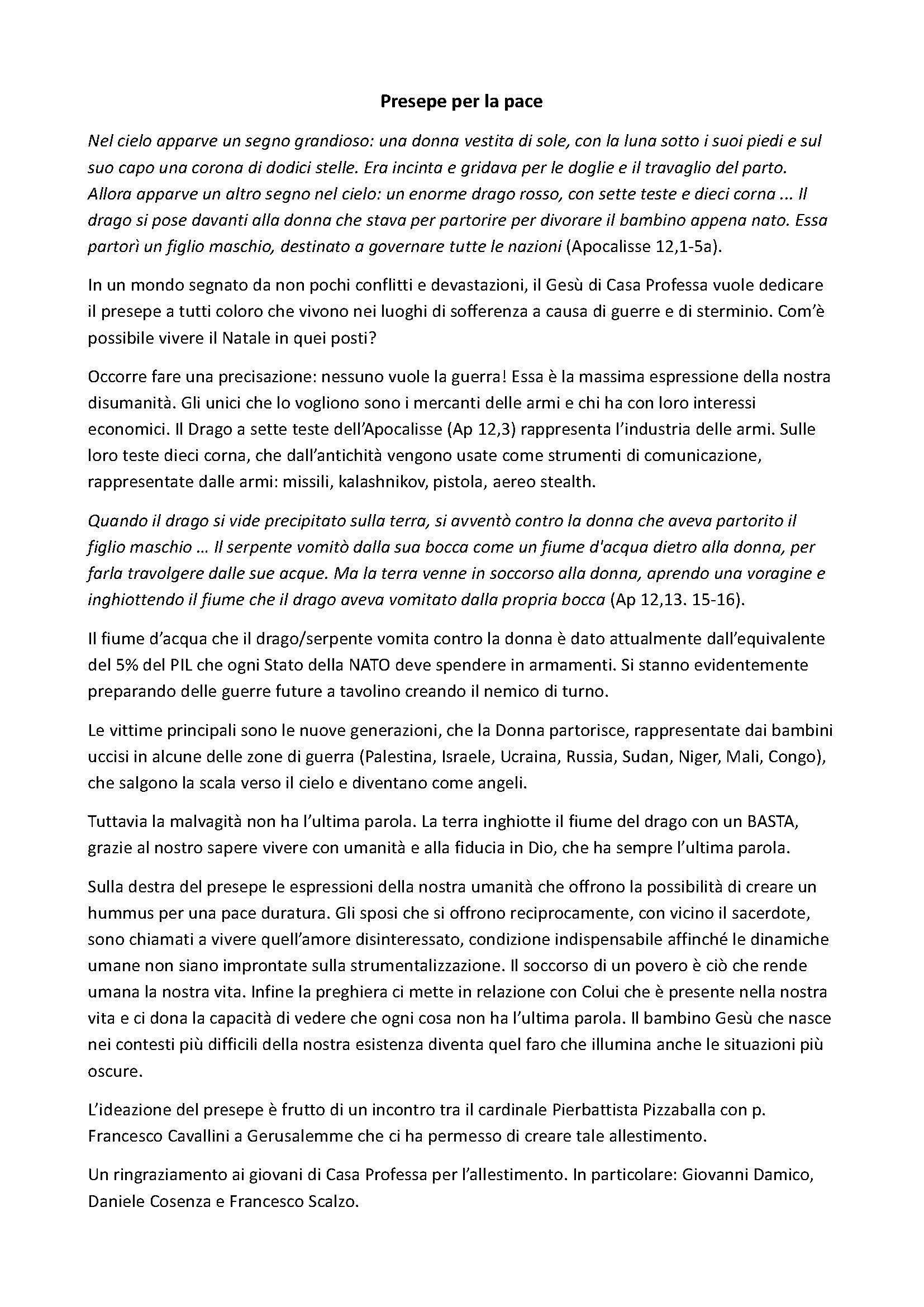 E' proposta di porsi in cammino, visitando i presepi, come fecero i pastori sollecitati dagli Angeli ed i Magi, riflettendo sulla venuta di nostro Signore sulla Terra e pregandolo perché ci sostenga nell'essere portatori di pace e di amore all'interno delle nostre famiglie, delle nostre comunità e di tutta la umana società.